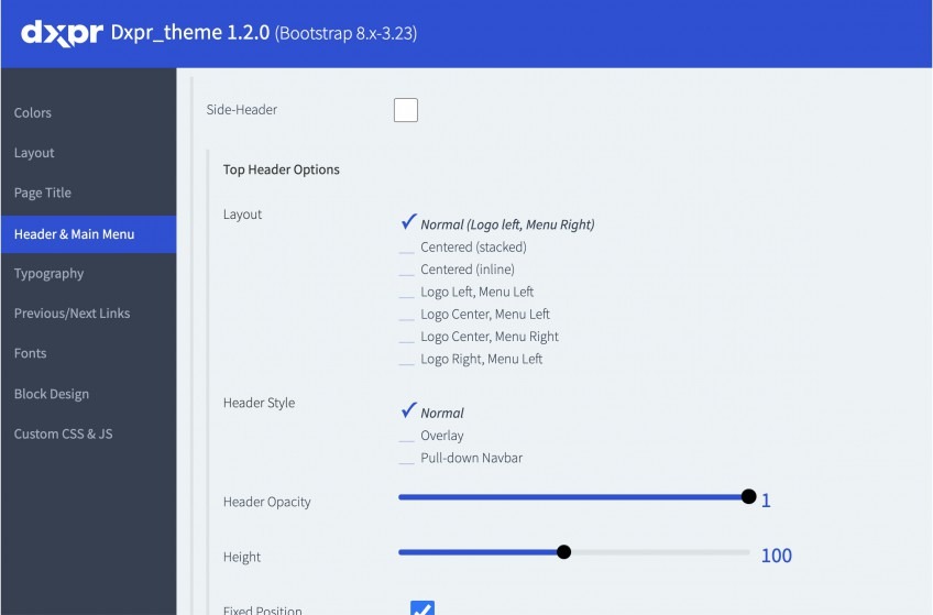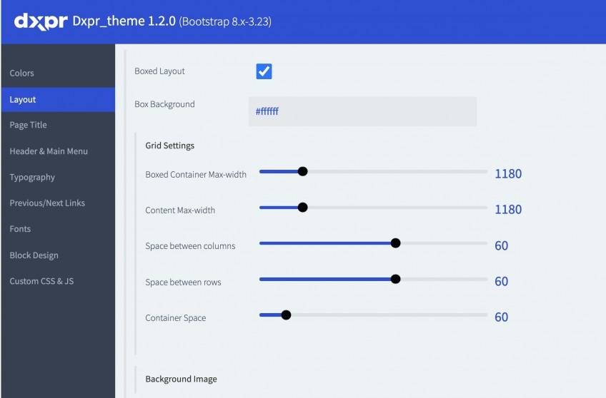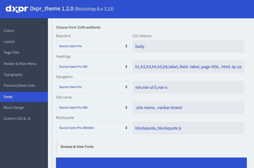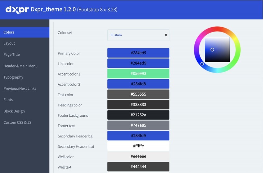 مع أكثر من 200 تخصيص، تضع لوحة تحكم إعدادات DXPR قوة Drupal بين يديك، دون الحاجة إلى أي تعليمات برمجية على الإطلاق. قم بتغيير الألوان والخطوط والعناوين والحشو والقوائم والتذييلات والأشرطة الجانبية وغير ذلك الكثير.